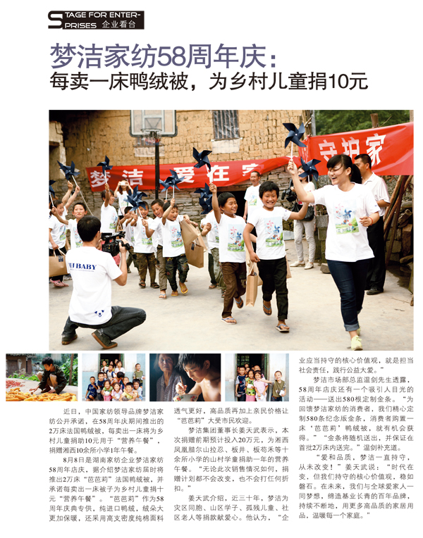 梦洁家纺58周年庆:每卖一床鸭绒被,为乡村儿童捐10元