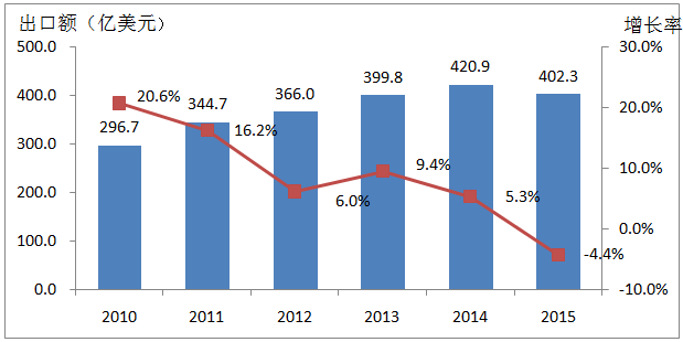 中国海关最新统计数据显示,2015年我国家纺产品累计出口402.3亿美元,同比下降4.4%。其中,出口数量同比下降1.8%,出口价格同比降低2.3%。出口疲软主要原因是国际市场需求下降以及汇率因素。2015年12月份当月出口36.2亿美元,同比增长0.2%,12月当月出口增速由负转正,其中出口欧盟、日本以及俄罗斯等主要市场较前11个月情况有所好转。
