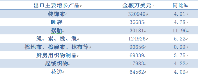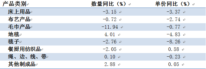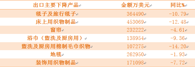 海关数据显示,家用纺织品出口大类中的具体产品中,装饰布、睡袋、花边、起绒织物等产品出口同比有所增长,而主流产品毯子、床上织物、被子、窗帘、浴巾、盥洗及厨房用棉制毛巾、地毯等皆出现大幅下降。