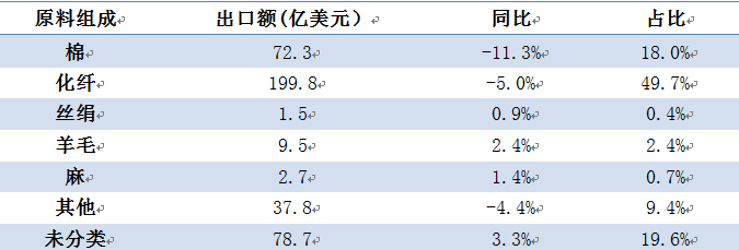 2015年海关数据显示,从家用纺织品出口产品的原料来看,化纤产品出口额为199.8亿美元,同比下降5%,化纤产品出口占到我国家纺产品出口额近一半左右的比例。棉制品出口72.3亿美元,同比下降11.3%,降幅最大,棉制品占家纺总出口额的18%。羊毛、丝绢和麻制品出口份额所占比例较低,分别出口9.5亿美元、1.5亿美元和2.7亿美元,同比较上年都小幅上升。其他原料的家纺产品出口37.8亿美元,同比下降4.4%,占出口总额的9.4%。另有19.6%比例的家纺产品未分原料组成。(注:未分类原料,是指产品出口税则号按照其生产工艺分类,此产品原料可能为棉、化纤以及其他)
