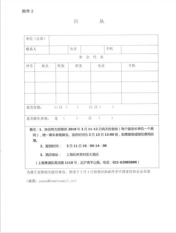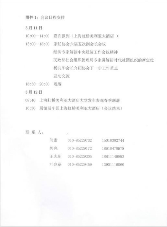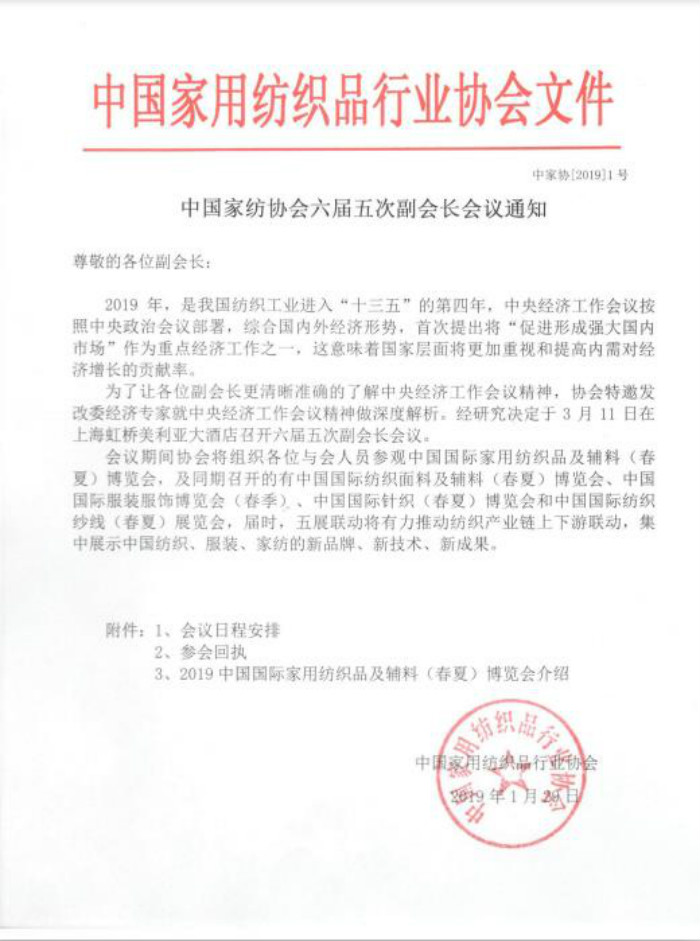 中国家纺协会六届五次副会长会议通知