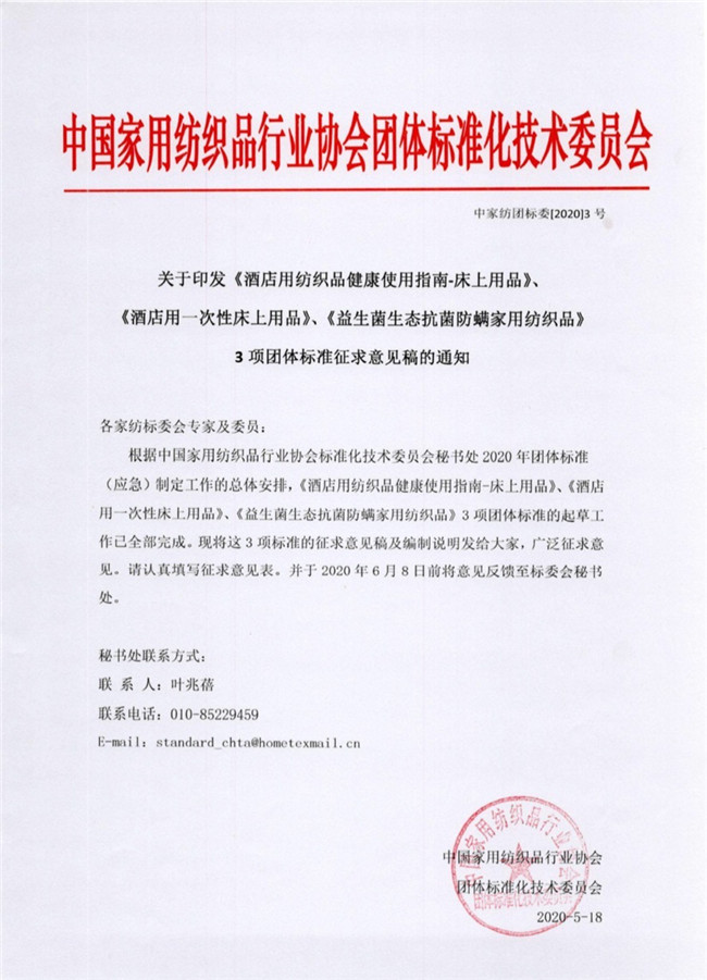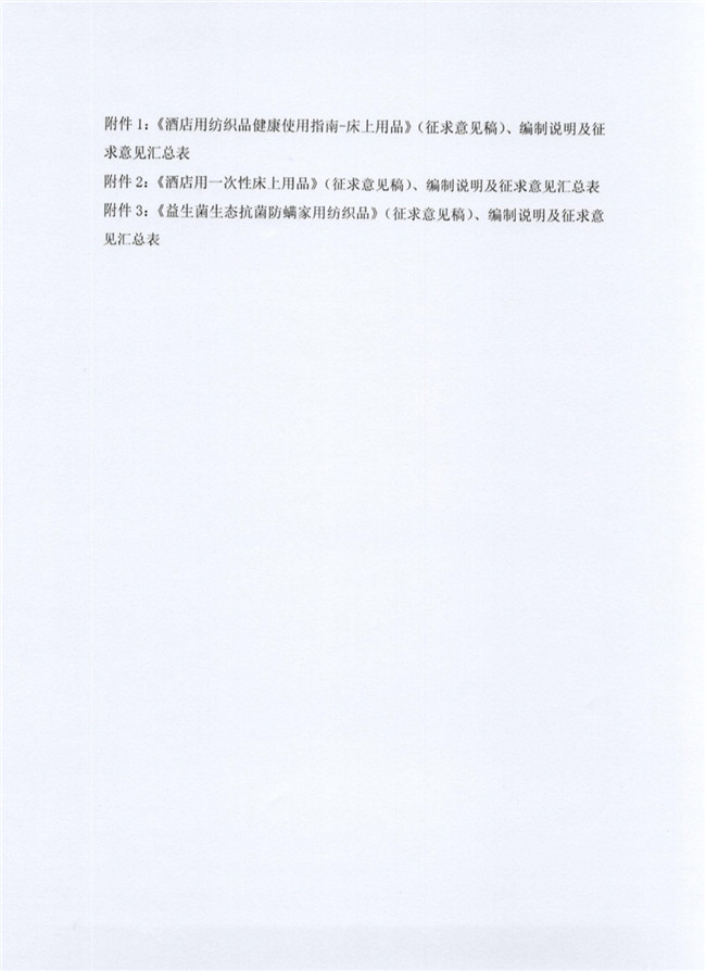 附件2:《酒店用一次性床上用品》(征求意见稿)、编制说明及征求意见汇总表(1).docx 附件3:《益生菌生态抗菌防螨家用纺织品》(征求意见稿)、编制说明及征求意见汇总表(1).docx