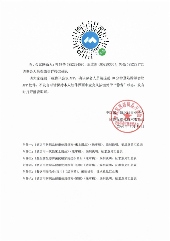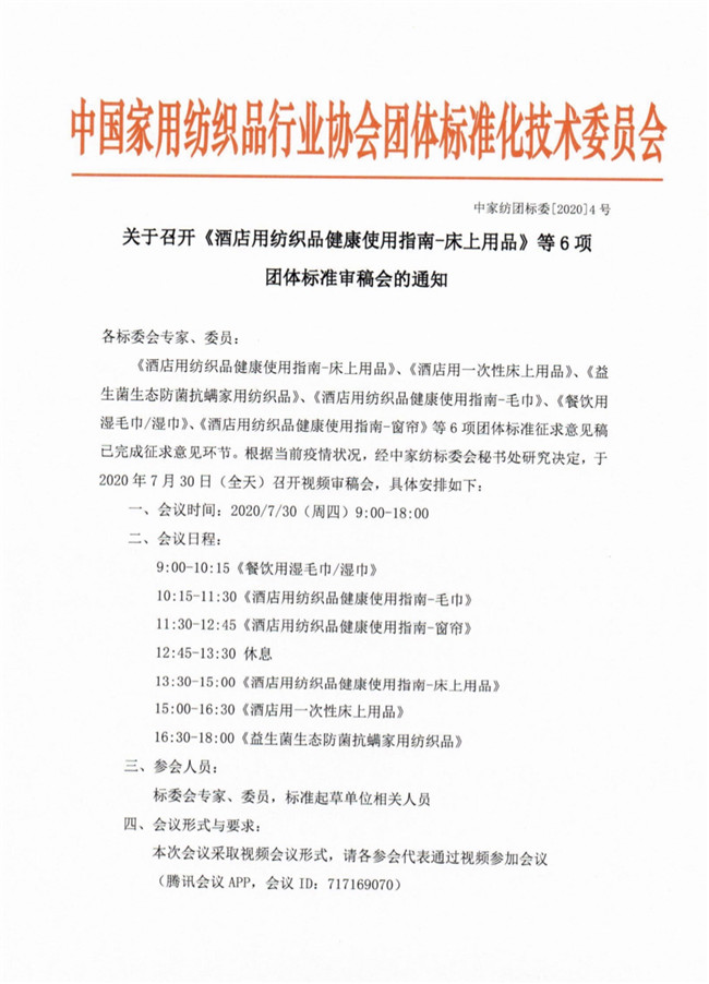 附件二:《酒店用一次性床上用品》(送审稿),编制说明,征求意见汇总表.docx 附件三:《益生菌生态防菌抗螨家用纺织品》,(送审稿),编制说明,征求意见汇总表.docx 附件四:《酒店用纺织品健康使用指南-毛巾》(送审稿),编制说明,征求意见汇总表.docx 附件五:《餐饮用湿毛巾湿巾》(送审稿),编制说明,征求意见汇总表.docx 附件六:《酒店用纺织品健康使用指南-窗帘》(送审稿),编制说明,征求意见汇总表.doc