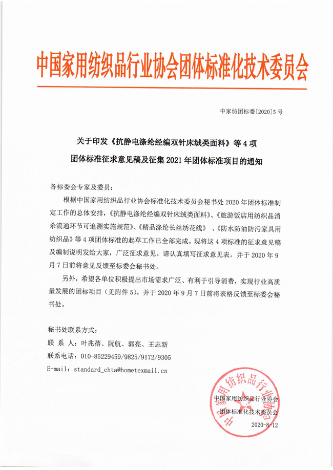 附件2,《旅游饭店用纺织品 消杀流通环节可追溯实施规范》(征求意见稿),编制说明及征求意见汇总表.docx 附件3,《精品涤纶长丝绣花线》(征求意见稿),编制说明及征求意见汇总表.docx 附件4,《防水防油防污家具用纺织品》(征求意见稿),编制说明及征求意见汇总表.docx 附件5,家纺协会团体标准项目建议书.docx
