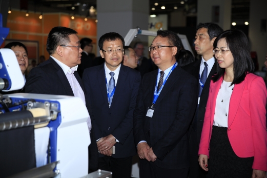 展会期间,中国纺织工业联合会副会长孙瑞哲(左三)在中国产业用纺织品行业协会会长李陵申(左二)、中国国际贸促会纺织分会副秘书长谢冰(右一)、中国产业用纺织品行业协会副会长郑俊林(右二)的陪同下,走访中国参展企业。顾萌 摄