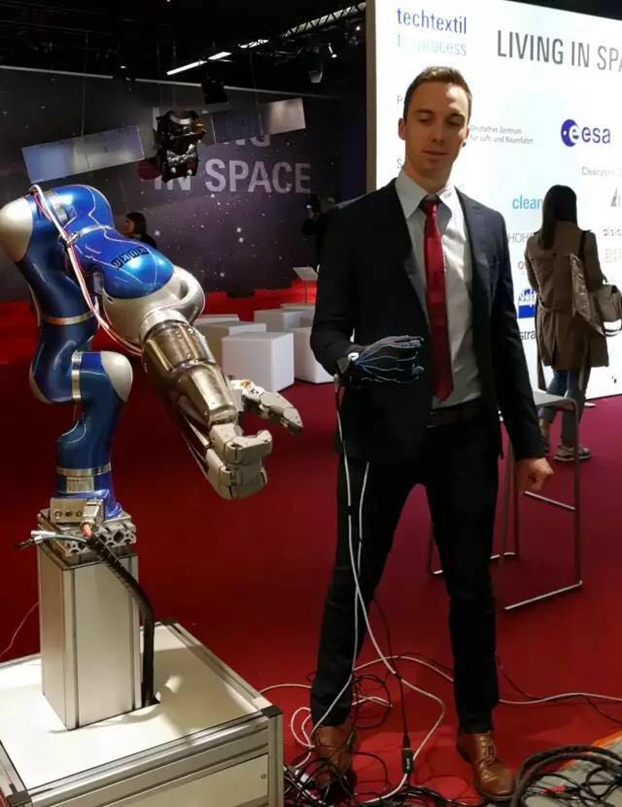 "太空生活"展区展示的德国宇航中心研究成果:有了这种和宇航员服装相连接的智能感应装置,宇航员在舱内任借手部的动作,就能直接感应和控制机器手在太空舱外超低温环境下执行维修等工作