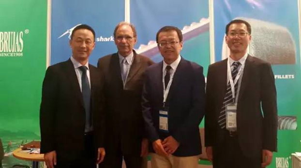 光山白鲨首次参展Techtextil产业用展,在展会上与合作多年的欧洲百年品牌BRUJAS(布鲁哈)达成全部收购股权的协议,下一步针布产品的海外市场将主打布鲁哈品牌。图为中纺联副会长李陵申(右二)、光山白鲨董事长张永钢(左一)和布鲁哈家族第四代胡安先生(左二)在展位上交流