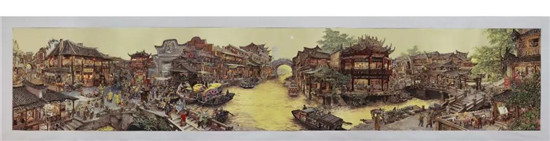 以绣像《阿房宫》为例,其绣工精细逼真,远看是画,近看是绣,泰国贵夫人素达拉感慨道:“太神奇、太生动了,人物栩栩如生,感觉就像真的一样。”