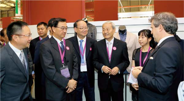 中国纺织工业联合会名誉会长杜钰洲(右三)、副会长兼秘书长高勇(右四),副会长徐文英(左二)等领导与参展企业亲切交流