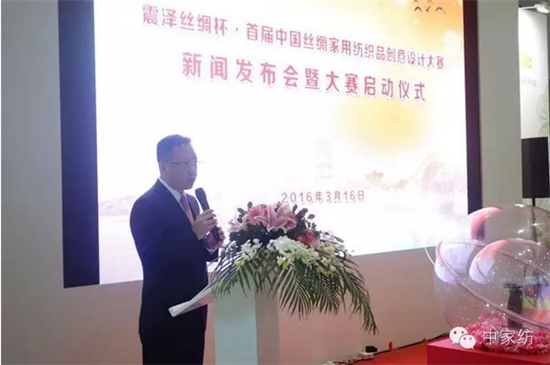 震泽镇党委书记陆斌首先致辞,他表示作为首届中国丝绸家用纺织品创意设计大赛将在具有“吴头越尾”之称的震泽举办意义深远。震泽是中国历史文化名镇,其纺织行业具有深厚的文化底蕴,著名的辑里湖丝就出产于震泽一带。目前全镇纺织业分布面较广,从事棉、麻、丝、毛、化纤等多种纺织和交织,形成从纺纱到织造、印染、成衣的完整产业链。现有纺织企业共600余家,2015年纺织业销售约150亿元,先后被命名为“中国亚麻绢纺名镇”和“中国蚕丝被家纺名镇”。本次大赛也是为广大丝绸产业提供供给侧改革,创造出更优更美更有生命力的丝绸产品的一次尝试。